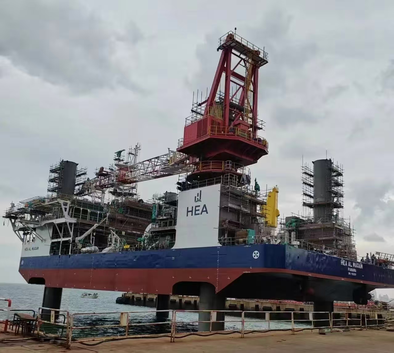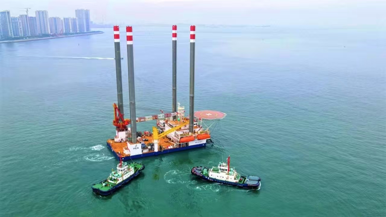 9月27日,TYPE3 PRO第二座自升式海上作業(yè)支持平臺下水后,經過升降系統(tǒng)調試,四條樁腿平穩(wěn)扎進海底實現(xiàn)了平臺站樁,隨后開展了平臺樁腿接長工作。